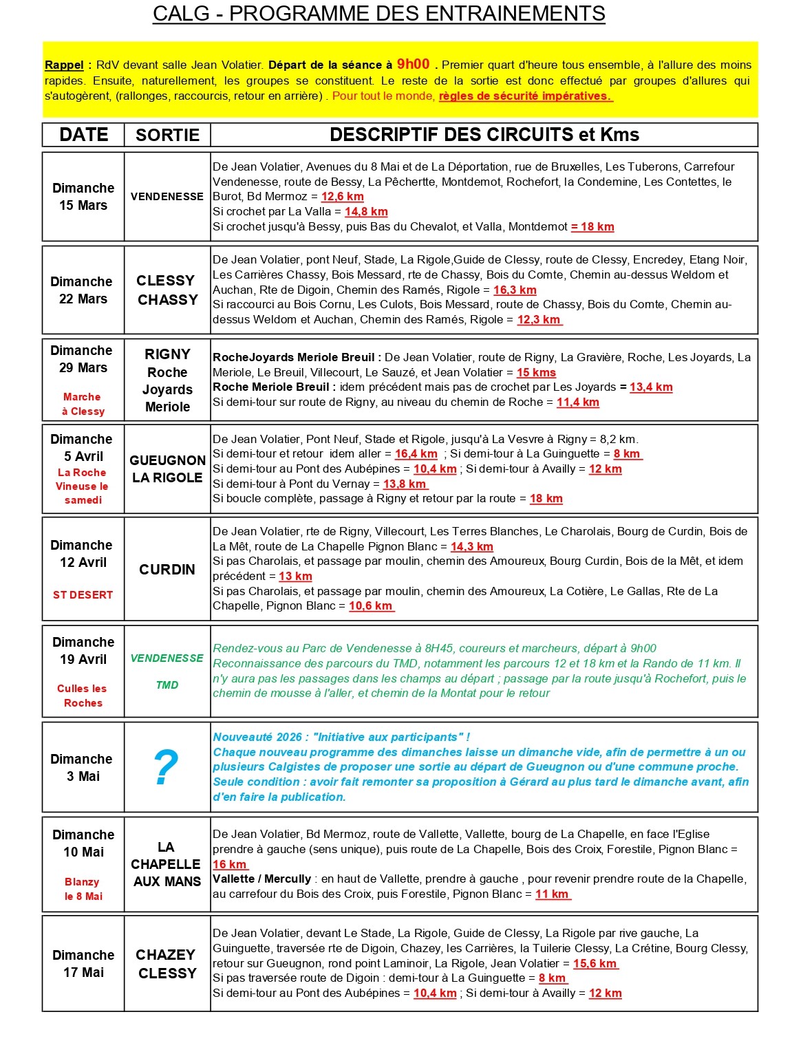Dimanche matin : rendez-vous à 8h45 Salle Jean Volatier, Boulevard Mermoz à Gueugnon. Parcours proposé, selon un programme établi et diffusé à l'avance. Celui-ci donne le lieu, tournant chaque dimanche en direction des communes proches de Gueugnon, et donc les distances proposées.
